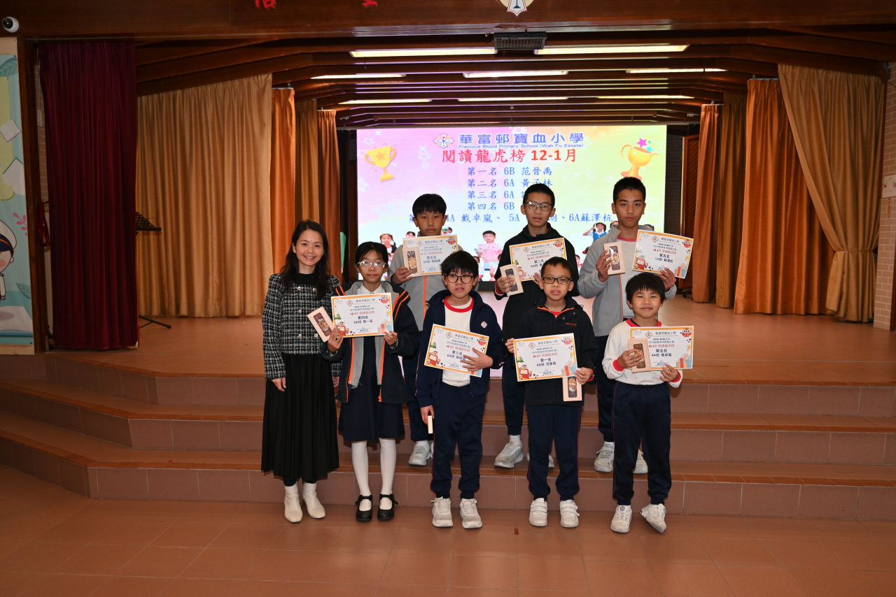| 2026-02-13 | 華富邨寶血小學 | 閱讀龍虎榜 12-1月 | 第一名 6B 范晉禹 第二名 6A 黃子林 第三名 6A 謝庭僖 第四名 6B 黎一安 第五名 4A 戴卓嵐、 5A 楊駿朗、6A蘇澤杭 | |